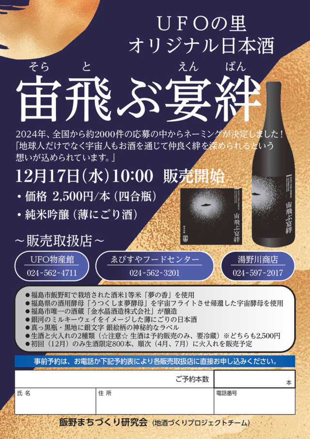 4/11(金)よりUFOの里オリジナル日本酒「宙飛ぶ宴絆」を販売しております。